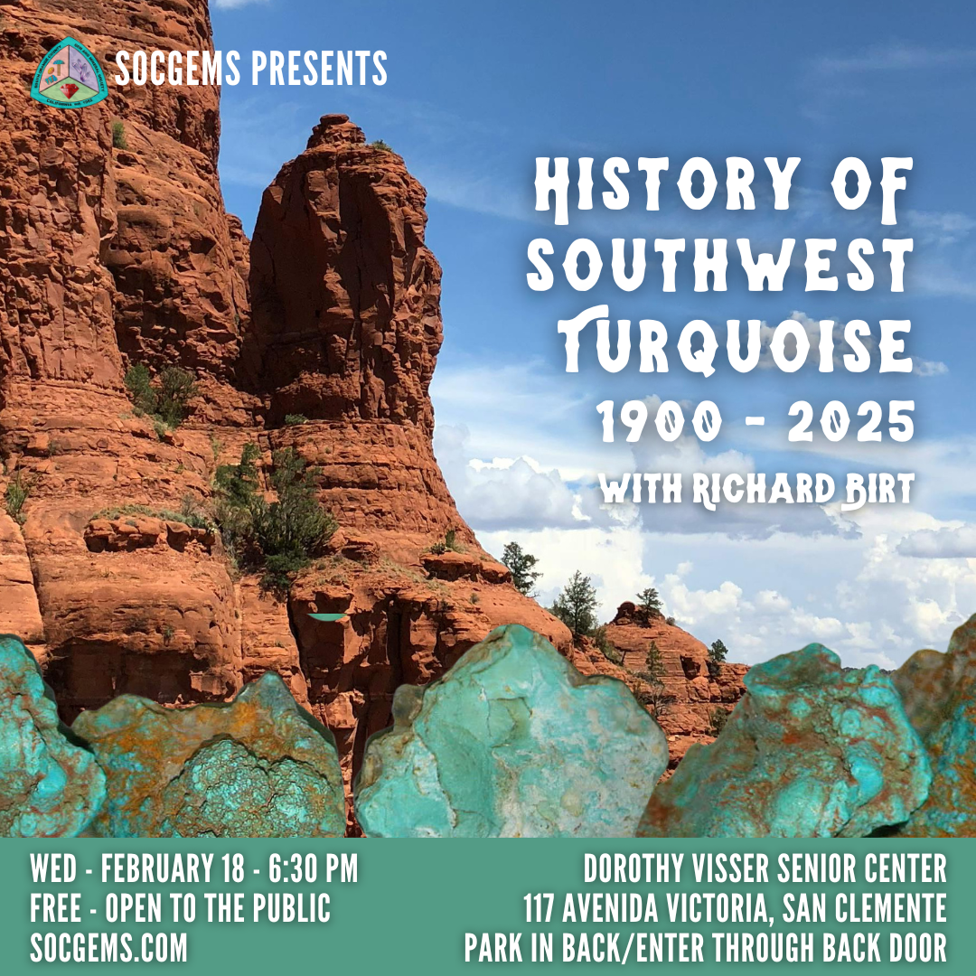 Founded in 1962, The South Orange County Gem and Mineral Society is a nonprofit organization dedicated to stimulating interest in the Earth Sciences and Lapidary Arts by furthering the knowledge of its members and the public, by disseminating knowledge, methods, and procedures for the study, collections, and classification, of rocks, minerals and fossils, and the methods to cut, alter, fashion, and convert Earth Science for specimens for lapidary purposes.